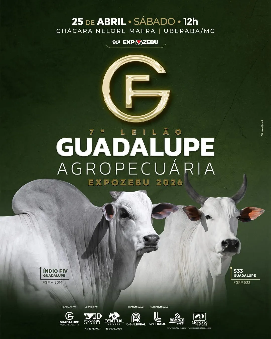 O 7° Leilão Guadalupe - Edição Expozebu 2026 é um evento de destaque voltado para a comercialização de gado da raça Nelore, com início programado para as 12:00. O remate será realizado na Chácara Mafra, em Uberaba/MG, contando com a organização da Programa Leilões. A transmissão ao vivo estará disponível pelo Canal Rural.
