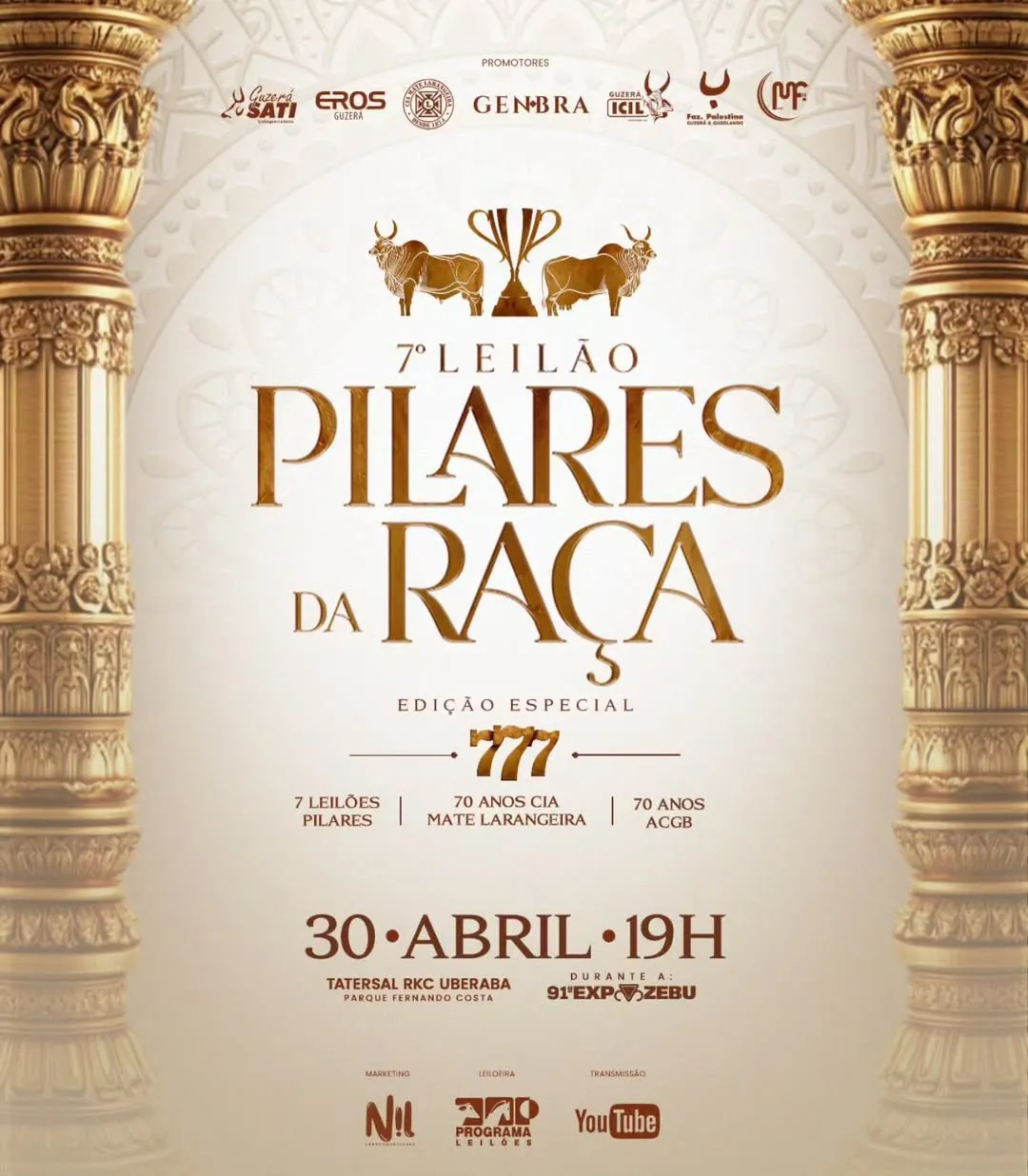 O 7º Leilão Pilares da Raça é um evento de destaque voltado para a comercialização de gado da raça Guzerá, com início programado para as 19:00. O remate será realizado no Centro de Eventos RKC, no Parque Fernando Costa, em Uberaba/MG, contando com a organização da Programa Leilões. A transmissão ao vivo estará disponível pelo Remate Web.