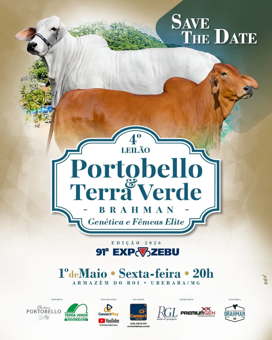 O Leilão Brahman Portobello e Terra Verde é um evento de destaque voltado para a comercialização de gado da raça Brahman, com início programado para as 20:00. O remate será realizado no Kiosk Armazém do Boi, no Parque Fernando Costa, em Uberaba/MG, contando com a organização da Connect Leilões. A transmissão ao vivo estará disponível pelo Connect Play.