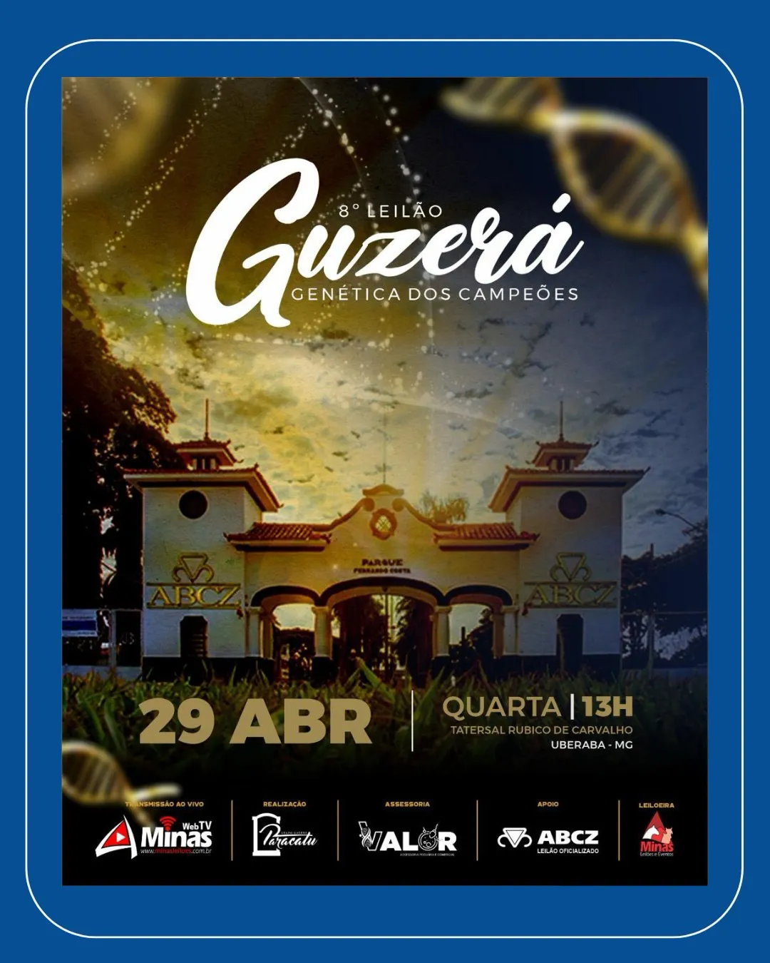 O Leilão Guzerá Genética de Campeões é um evento de destaque voltado para a comercialização de gado da raça Guzerá, com início programado para as 13:00. O remate será realizado no Tatersal Rubico Carvalho, Parque Fernando Costa, em Uberaba/MG, contando com a organização da Minas Leilões. A transmissão ao vivo estará disponível pelo Site Minas Leilões.