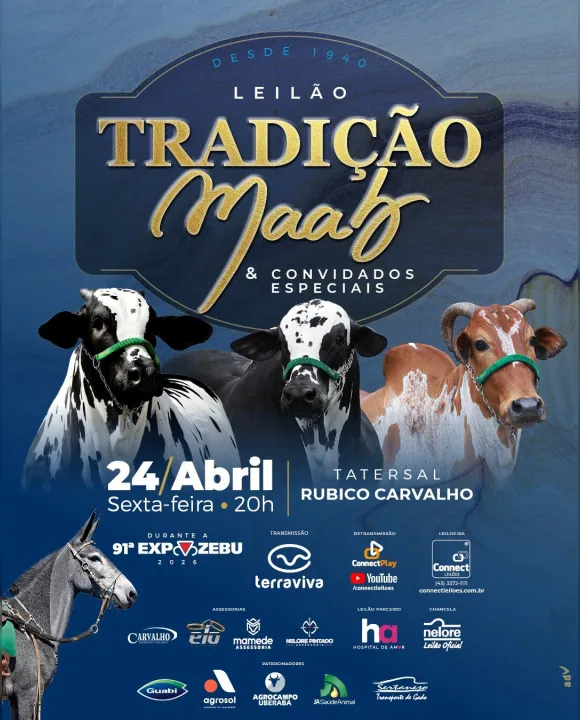 O Leilão Tradição Maab é um evento de destaque voltado para a comercialização de gado da raça Nelore, com início programado para as 20:00. O remate será realizado no Tatersal Rubico Carvalho, no Parque Fernando Costa, em Uberaba/MG, contando com a organização da Connect Leilões. A transmissão ao vivo estará disponível pela Terra Viva.